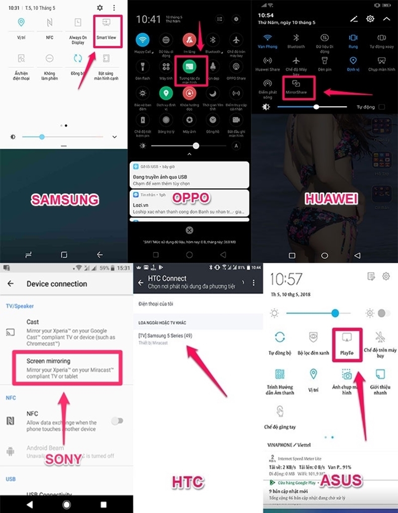 sử dụng tính năng Phản chiếu màn hình từng điện thoại android (samsung, oppo, sony ..)như hình minh họa.